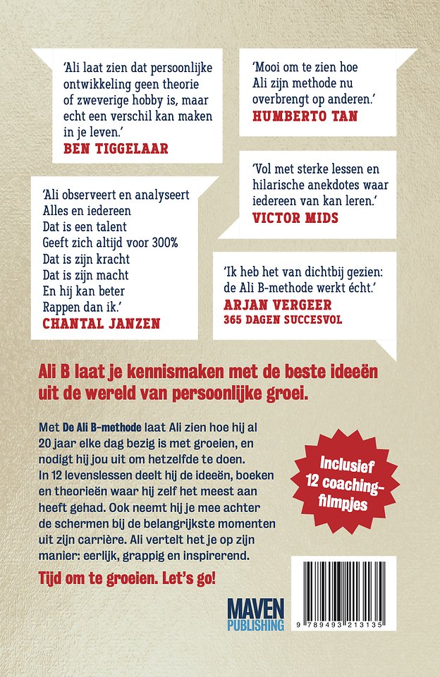 Met De Ali B-methode laat Ali zien hoe hij al 20 jaar elke dag bezig is met groeien en nodigt hij jou uit om hetzelfde te doen. In 12 levenslessen deelt hij de ideeën, boeken en theorieën waar hij zelf het meest aan heeft gehad. En hij neemt je mee achter de schermen bij de belangrijkste momenten uit zijn carrière. Ali vertelt het je op zijn manier: geestig, openhartig en inspirerend.