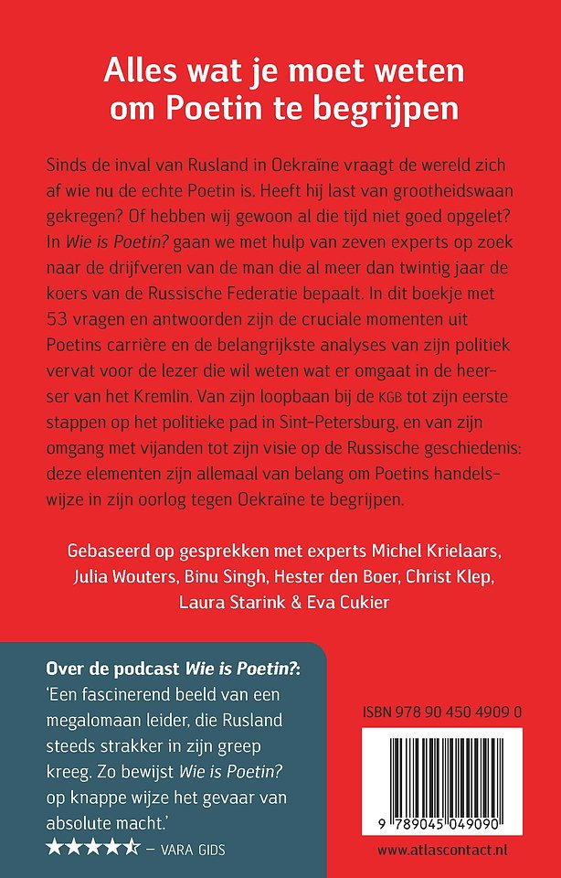 In dit boekje met 53 vragen en antwoorden zijn de cruciale momenten uit zijn carrière en de belangrijkste inzichten uit de podcastserie vervat voor de lezer die wil weten wat er om gaat in de heerser van het Kremlin. In de succesvolle podcast Wie is Poetin? gingen zeven experts op zoek naar de drijfveren van Vladimir Poetin, die al meer dan twintig jaar de koers van de Russische Federatie bepaalt. Hoe was zijn jeugd, wie zijn zijn vrienden en welke sleutelmomenten hebben zijn visie op de wereld bepaald?