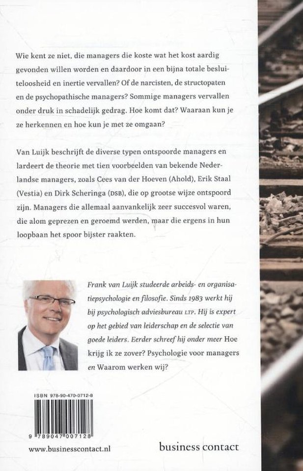 Van Luijk beschrijft de diverse typen ontspoorde managers en lardeert de theorie met tien voorbeelden van bekende Nederlandse managers, zoals Cees van der Hoeven (Ahold), Erik Staal (Vestia) en Dirk Scheringa (DSB), die op grootse wijze ontspoord zijn. Managers die allemaal aanvankelijk zeer succesvol waren, die alom geprezen en geroemd werden, maar die ergens in hun loopbaan het spoor bijster raakten.