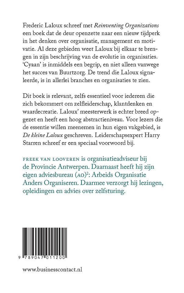 Meer over Freek Van Looveren'De kleine Laloux' van Freek Van Looveren is een handige samenvatting van Laloux' baanbrekende gedachtegoed over zelfsturing en nieuw organiseren. Frederic Laloux schreef met 'Reinventing Organizations' een boek dat de deur openzette naar een nieuw tijdperk in het denken over organisatie, management en motivatie.