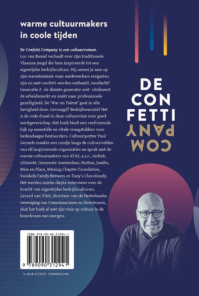 ‘De Confetti Company’ is een uniek boek gevuld met de cultuurvisie van veertien topbestuurders. Het boek is een inspiratieboek voor ondernemers & bestuurders van bedrijven, organisaties, instellingen en (semi)publieke overheden. De persoonlijke cultuurvisie van de auteur maakt het boek verhalend, vlot en geestig. Luc van Bussel is een verhalenverteller met een indringende boodschap over empathie en bedrijfswarmte.