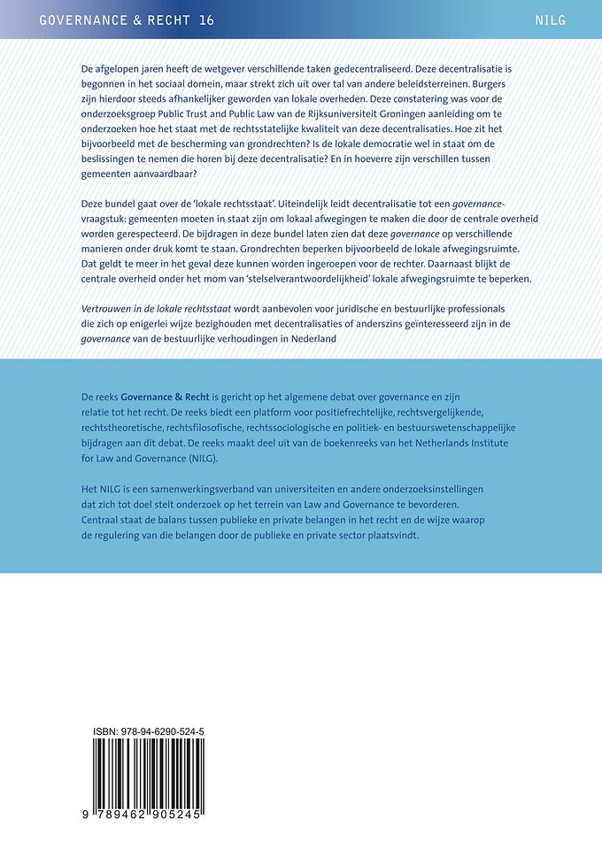 Deze bundel gaat over de ‘lokale rechtsstaat’. Uiteindelijk leidt decentralisatie tot een governancevraagstuk: gemeenten moeten in staat zijn om lokaal afwegingen te maken die door de centrale overheid worden gerespecteerd. De bijdragen in deze bundel laten zien dat deze governance op verschillende manieren onder druk komt te staan. Grondrechten beperken bijvoorbeeld de lokale afwegingsruimte. Dat geldt te meer in het geval deze kunnen worden ingeroepen voor de rechter. Daarnaast blijkt de centrale overheid onder het mom van ‘stelselverantwoordelijkheid’ lokale afwegingsruimte te beperken.