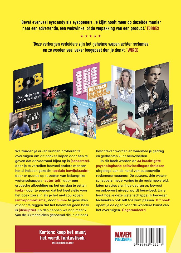 In dit boek worden de 33 krachtigste psychologische beïnvloedingstechnieken uitgelegd aan de hand van succesvolle reclamecampagnes. De auteurs, drie wetenschappers met ervaring in de reclamewereld, laten precies zien hoe gedrag op bewust en onbewust niveau wordt beïnvloed. En je leert hoe je deze wetenschappelijk bewezen technieken ook zelf toe kunt passen. Dit boek opent je de ogen voor de wondere kunst van het overtuigen. Gegarandeerd.