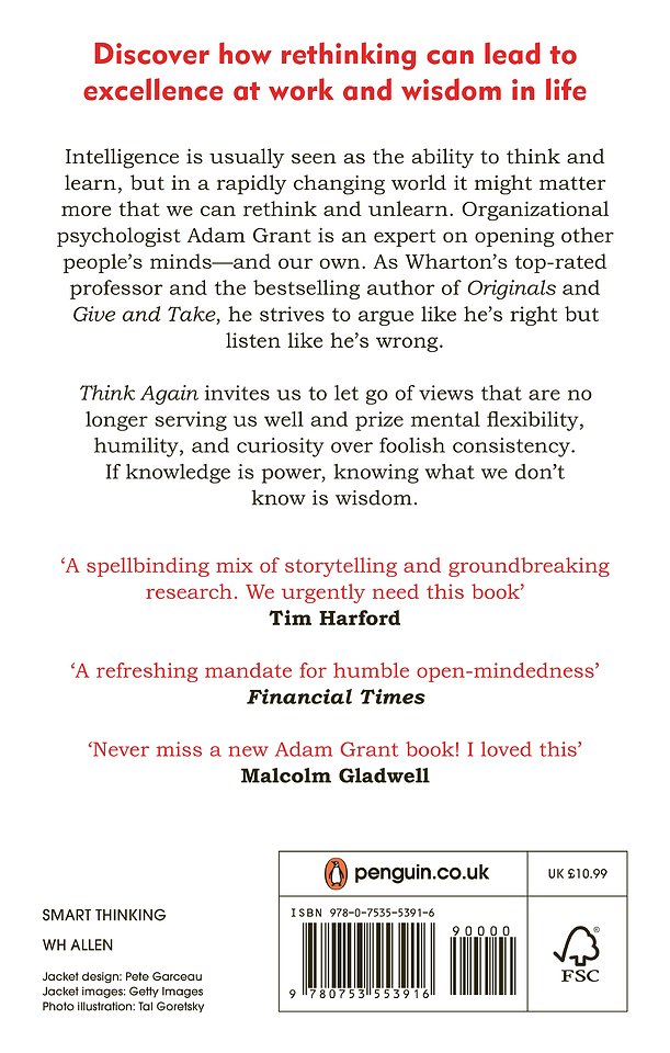 Told through fascinating stories, informed by cutting-edge research and illustratedwith amazing insights from Adam Grant's conversations with people such as Elon Musk, Hilary Clinton's campaign team, top CEOs and leading scientists, this is the ultimate guide to keeping your thinking fresh, learning when to question your ideas and update your own opinions, and how to inspire those around you to do the same.