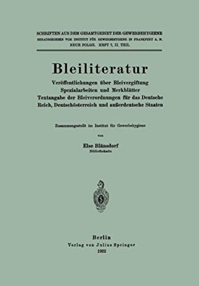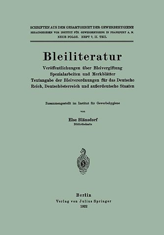 Veröffentlichungen über Bleivergiftung Spezialarbeiten und Merkblätter Textangabe der Bleiverordnungen für das Deutsche Reich, Deutschösterreich und außerdeutsche Staaten