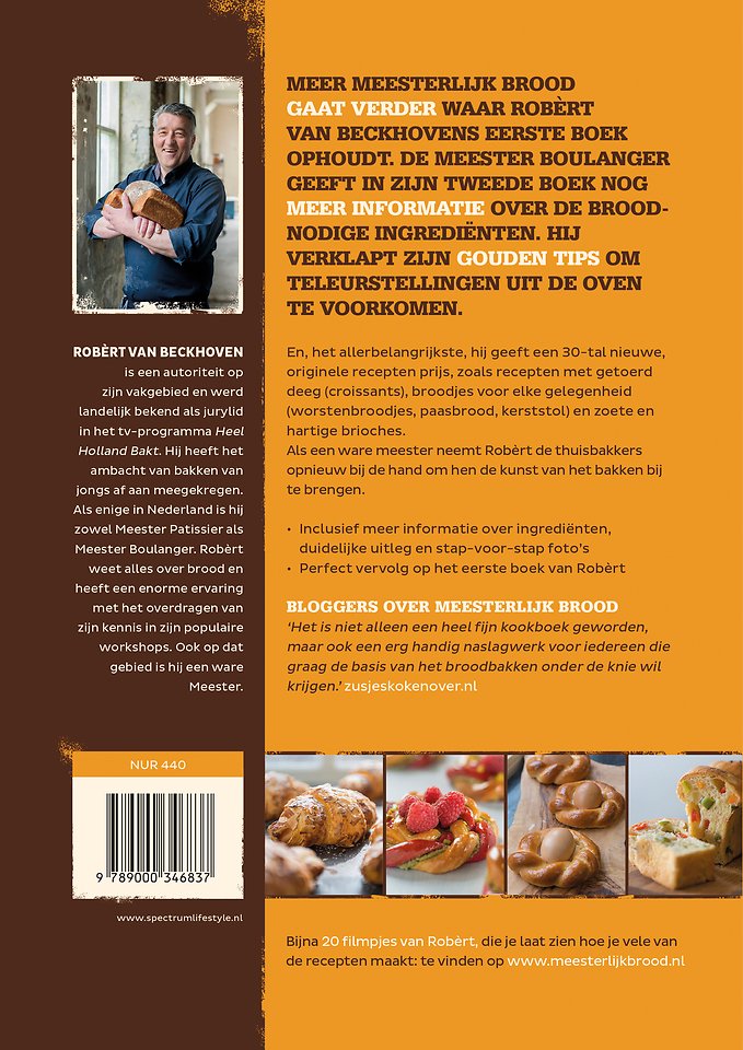 Meer meesterlijk brood gaat verder waar Robèrt van Beckhovens eerste boek Meesterlijk brood ophoudt. De Meester Boulanger geeft in zijn tweede boek nog meer informatie over de broodnodige ingrediënten. Hij verklapt de tien gouden tips om teleurstellingen uit de oven te voorkomen. En, het allerbelangrijkste, hij geeft een dertigtal nieuwe, originele recepten prijs, zoals recepten met getoerd deeg (croissants), broodjes voor elke gelegenheid (worstenbroodjes, paasstol, kerstbrood) en zoete en hartige brioche. Als een ware meester neemt Robèrt de thuisbakker bij de hand om hem door middel van gevarieerde recepten, duidelijke uitleg, stap-voor-stap foto’s en filmpjes de kunst van het bakken bij te brengen.