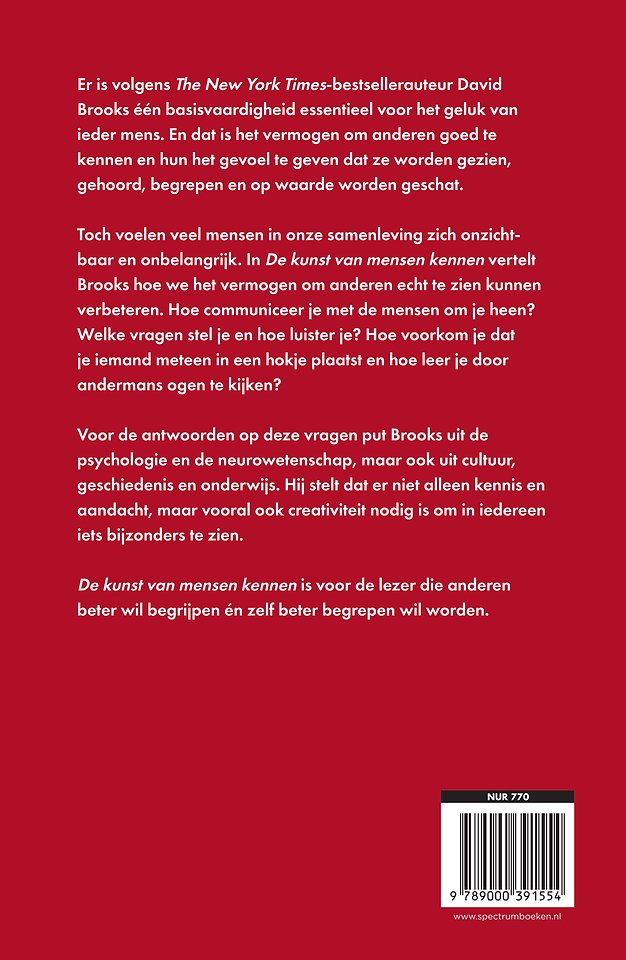 Toch voelen veel mensen in onze samenleving zich onzichtbaar en onbelangrijk. In 'De kunst van mensen kennen' vertelt Brooks hoe we het vermogen om anderen echt te zien kunnen verbeteren. Hoe communiceer je met de mensen om je heen? Welke vragen stel je en hoe luister je? Hoe voorkom je dat je iemand meteen in een hokje plaatst en hoe leer je door andermans ogen te kijken?