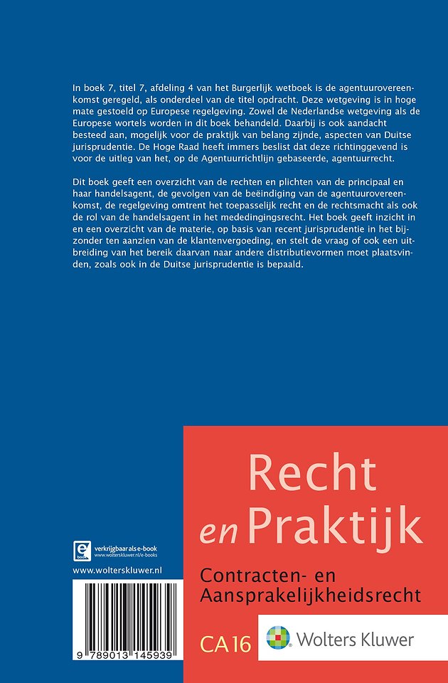 In De agentuurovereenkomst leest u alles over de agentuurovereenkomst. Zoals de rechten, de plichten en de gevolgen van het beëindigen van de agentuurovereenkomst voor zowel de principaal als de handelsagent. In dit boek worden het Nederlands agentuurrecht en de Europese wortels daarvan behandeld. Ook wordt veel aandacht besteed aan voor de praktijk van belang zijnde aspecten van Duits agentuurrecht.