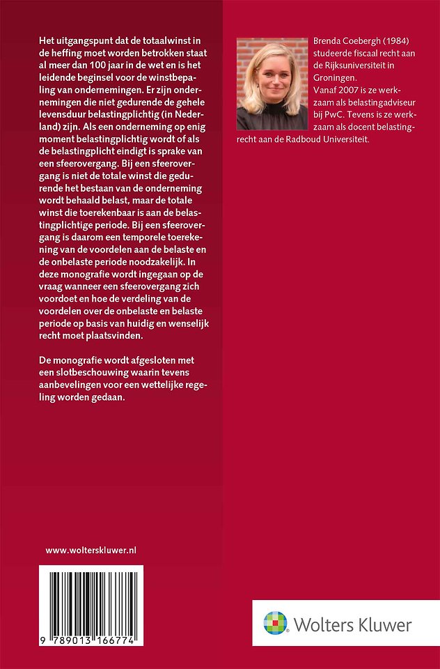 Sfeerovergangen in de winstsfeer levert een pionierend en integraal onderzoek naar de totaalwinst en sfeerovergangen in de winstsfeer. De lezer krijgt antwoord op de vraag wanneer een sfeerovergang zich voordoet en hoe de verdeling van de winst over de onbelaste en belaste periode op basis van huidig en wenselijk recht moet plaatsvinden. De titel geeft onder meer inzicht in de aanvang van subjectieve belastingplicht, grensoverschrijdende sfeerovergangen, exitheffingen en de toepassing van objectieve vrijstellingen.