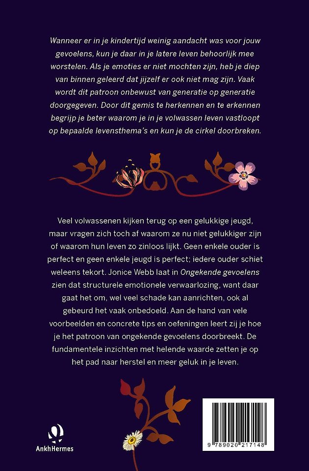 In Ongekende gevoelens, Over emotionele bagage en de invloed daarvan op (volwassen) kinderen van Jonice Webb leer je de emotionele bagage vanuit je relatie met je ouders (en hun relatie met hun ouders) te herkennen en het patroon van ongekende emoties te doorbreken.