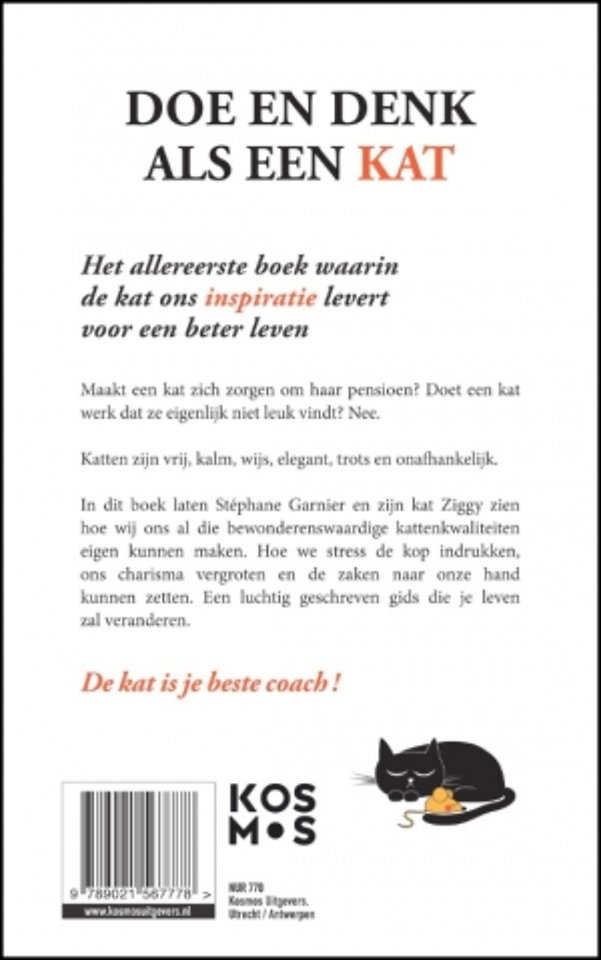 Hoe we stress de kop kunnen indrukken, ons charisma kunnen vergroten en belangrijke zaken naar onze hand kunnen zetten. Stéphane Garnier heeft ongeveer veertig kwaliteiten ontdekt die onlosmakelijk met de kat verbonden zijn, maar die heel goed toe te passen in het dagelijkse leven van de mens. Doe en denk als een kat en word een levenslustig, stressvrij, trots en charismatisch iemand.