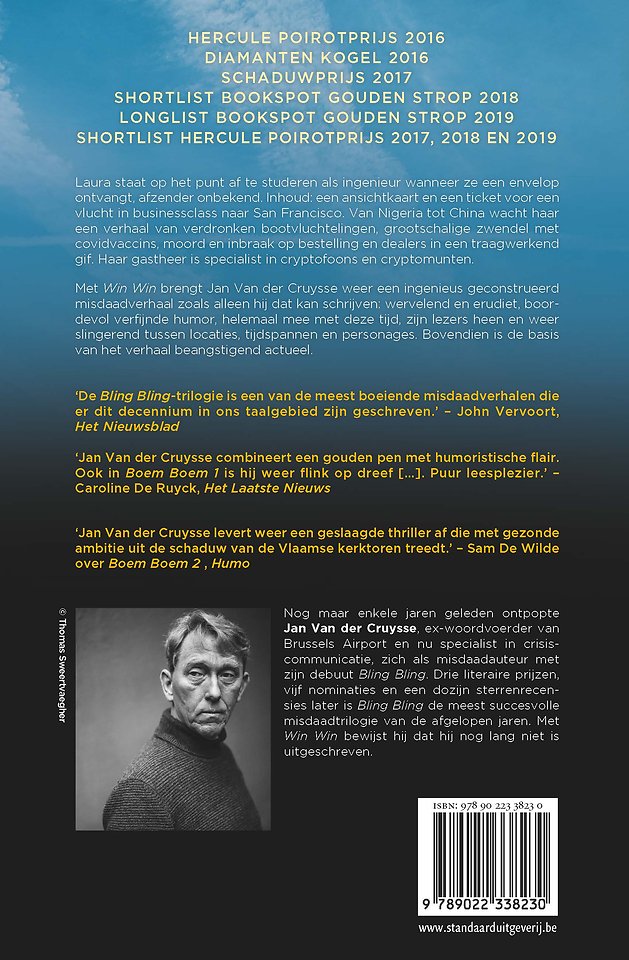 Met Win Win brengt Jan Van der Cruysse weer een ingenieus geconstrueerd misdaadverhaal zoals alleen hij dat kan schrijven: wervelend en erudiet, boordevol verfijnde humor, helemaal mee met deze tijd, zijn lezers heen en weer slingerend tussen locaties, tijdspannen en personages. Bovendien is de basis van het verhaal beangstigend actueel.