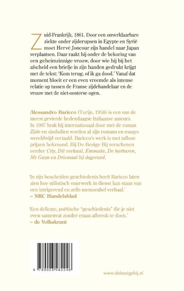 Zuid-Frankrijk, 1861. Door een onverklaarbare ziekte onder zijderupsen in Egypte en Syrië moet Hervé Joncour zijn handel naar Japan verplaatsen. Daar raakt hij onder de bekoring van een geheimzinnige vrouw, door wie hij bij het afscheid een briefje in zijn handen gedrukt krijgt met de tekst: ‘Kom terug, of ik ga dood.’ Vanaf dat moment bloeit er een even vreemde als intense relatie op tussen de Franse zijdehandelaar en de vrouw met de niet-oosterse ogen.