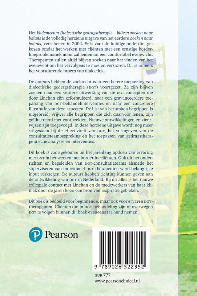 Het 'Vademecum Dialectische gedragstherapie' - blijven zoeken naar balans is de volledig herziene uitgave van het eerdere Zoeken naar balans, verschenen in 2002. Er is voor de huidige ondertitel gekozen omdat het werken met cliënten met een ernstige borderlineproblematiek nooit zal leiden tot een comfortabel evenwicht. Therapeuten zullen altijd blijven zoeken naar het vinden van het evenwicht om het vervolgens te moeten verstoren. Dit is immers het voortdurende proces van dialectiek.