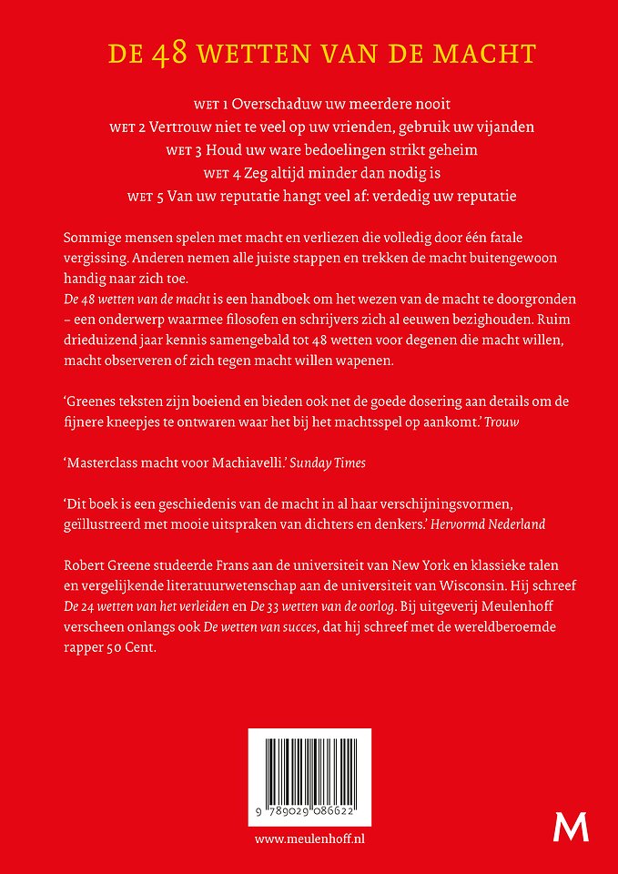 Sommige mensen spelen met macht en verliezen die volledig door één fatale vergissing. Anderen nemen alle juiste stappen en halen buitengewoon handig de macht naar zich toe. 'De 48 wetten van de macht' is een handboek om het wezen van de macht te doorgronden - een onderwerp waarmee filosofen en schrijvers zich al eeuwenlang bezighouden. Ruim drieduizend jaar kennis samengebald tot achtenveertig wetten voor degenen die macht willen, macht observeren of zich tegen macht willen wapenen.