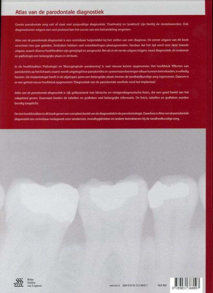 Atlas parodontale diagnostiek is een onmisbaar hulpmiddel bij het stellen van een diagnose. De eerste uitgave van dit boek verscheen tien jaar geleden. Sindsdien hebben veel ontwikkelingen plaatsgevonden. Vandaar dat het tijd werd voor deze tweede uitgave, waarin diverse hoofdstukken zijn gewijzigd en aangevuld. Net als in de eerste uitgave krijgen, naast diagnostiek, de anatomie en pathologie een belangrijke plaats in dit boek.In de hoofdstukken 'Pathologie' en 'Mucogingivale aandoening' is veel nieuwe kennis opgenomen. Het hoofdstuk 'Effecten van parodontitis op het lichaam', waarin wordt uitgelegd hoe parodontitis en systeemaandoeningen elkaar kunnen beïnvloeden, is volledig herzien. De implantologie heeft in de afgelopen jaren een belangrijke plaats binnen de tandheelkundige zorg ingenomen. Daarom is er een geheel nieuw hoofdstuk opgenomen: 'Diagnostiek van de parodontale weefsels rond het implantaat'.Atlas parodontale diagnostiek is rijk geïllustreerd met klinische en röntgendiagnostische foto's, die een goed beeld van het vakgebied geven. Daarnaast bieden de tabellen en grafieken veel belangrijke informatie. De foto's, tabellen en grafieken worden bondig toegelicht. De tien hoofdstukken in dit boek geven een compleet beeld van de diagnostiek in de parodontologie.