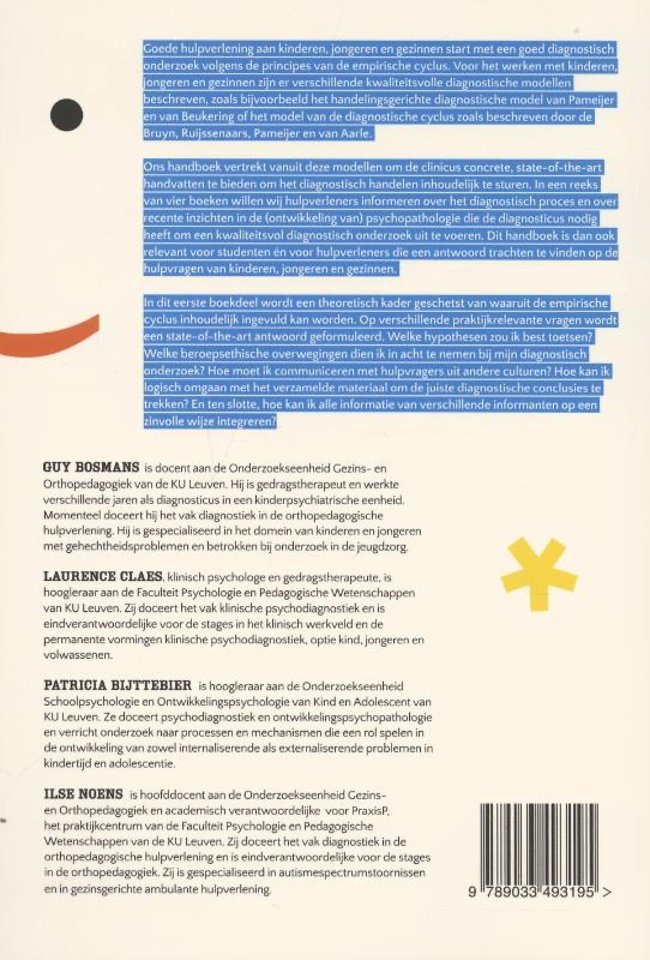Goede hulpverlening aan kinderen,jongeren en gezinnen start met een goed diagnostisch onderzoek volgens de principes van de empirische cyclus. Ons handboek vertrekt vanuit de bestaande kwaliteitsvolle diagnostische modellen om de clinicus concrete, state-of-the-art handvatten te bieden om het diagnostisch handelen inhoudelijk te sturen. In een reeks van vier boeken willen wij hulpverleners informeren over het diagnostisch proces en over recente inzichten in de (ontwikkeling van) psychopathologie die de diagnosticus nodig heeft om een kwaliteitsvol diagnostisch onderzoek uit te voeren.
