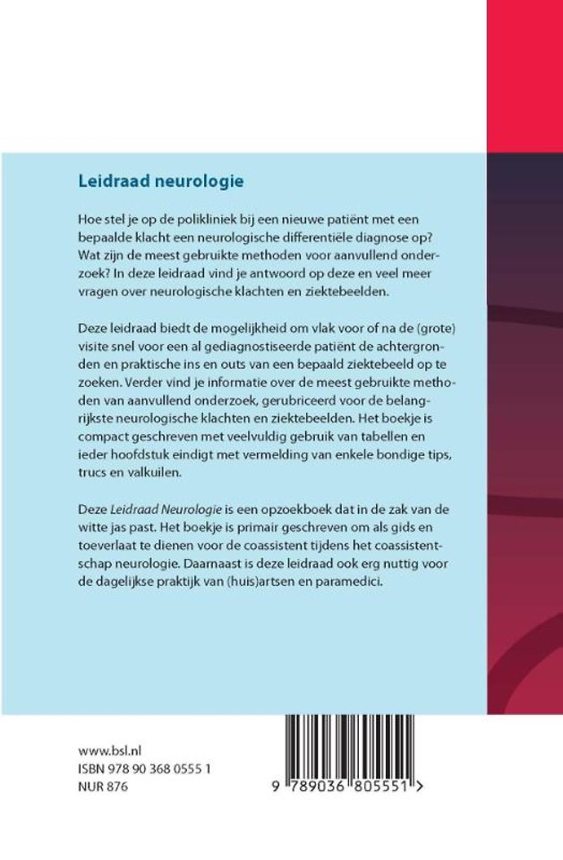 De Leidraad Neurologie, uitgevoerd in handig zakformaat, geeft een handleiding voor neurologisch onderzoek. Het neurologisch onderzoek omvat het klinisch onderzoek naar de functie van het zenuwstelsel en is vooral bedoeld om functiestoornissen aan het licht te brengen. Door de subtiele organisatie van het zenuwstelsel is het vaak mogelijk om niet alleen de dysfunctie vast te stellen, maar ook de onderliggende functiestoornis te lokaliseren. Dit laatste vormt dan het uitgangspunt voor aanvullend hulponderzoek, waarbij de neuroloog meer en meer terugvalt op neuro-imaging, een diagnostische techniek die zich stormenderhand ontwikkelt. Op deze techniek is deze leidraad dan ook gebaseerd. Het accent ligt vooral op het "waarom" van een bepaald onderzoek. Om dit inzicht te bevorderen, wordt als regel teruggevallen op de onderliggende neuroanatomie en neurofysiologie, zoals behandeld in het leerboek Neurologie: structuur, functie en dysfunctie van het zenuwstelsel. De Leidraad Neurologie verschijnt in de Co-reeks, een nieuwe reeks praktische boekjes in zakformaat voor (aankomend) artsen, studenten geneeskunde, beginnende assistenten en paramedici.