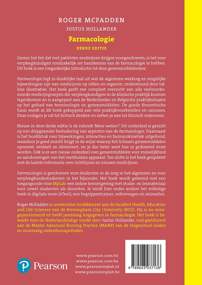 Farmacologie legt in duidelijke taal uit wat de algemene werking en mogelijke bijwerkingen zijn van medicijnen op cellen en organen, ondersteund door talloze illustraties. Het boek geeft een compleet overzicht van alle veelvoorkomende medicijngroepen die verpleegkundigen in de klinische praktijk kunnen tegenkomen en is aangepast aan de Nederlandse en Belgische praktijksituatie op het gebied van terminologie en geneesmiddelen. De goede theoretische basis wordt in dit boek gekoppeld aan vele praktijkvoorbeelden en casussen. Deze nodigen je uit tot kritisch denken en zetten je aan tot klinisch redeneren.