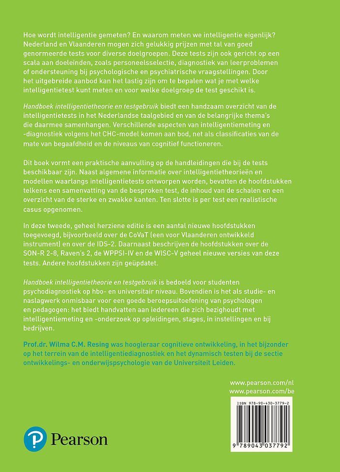 Handboek intelligentietheorie en testgebruik is bedoeld voor studenten psychodiagnostiek op hbo- en universitair niveau. Bovendien is het als studie- en naslagwerk onmisbaar voor een goede beroepsuitoefening van psychologen en pedagogen: het biedt handvatten aan iedereen die zich bezighoudt met intelligentiemeting en -onderzoek op opleidingen, stages, in instellingen en bij bedrijven.