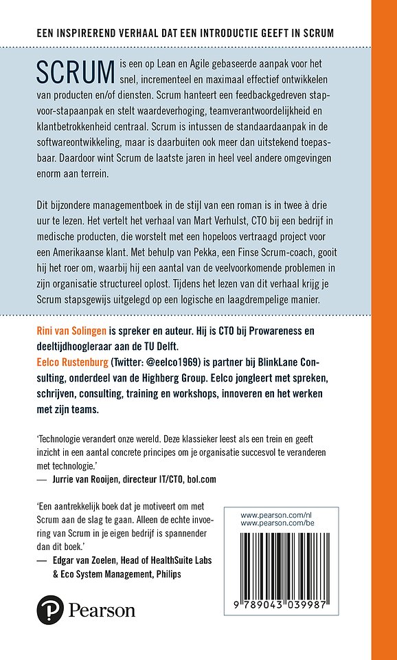 Meer over de auteursEen inspirerend verhaal over een revolutionaire projectmanagementmethode. Scrum is een op Lean gebaseerde projectmanagementmethode voor het snel en effectief ontwikkelen van software. Scrum hanteert een stap-voor-stapaanpak en stelt waardeverhoging, teamverantwoordelijkheid en klantbetrokkenheid centraal. Scrum wordt al veel gebruikt in de IT, maar is ook daarbuiten uitstekend toepasbaar en wint de laatste jaren dan ook enorm aan populariteit.