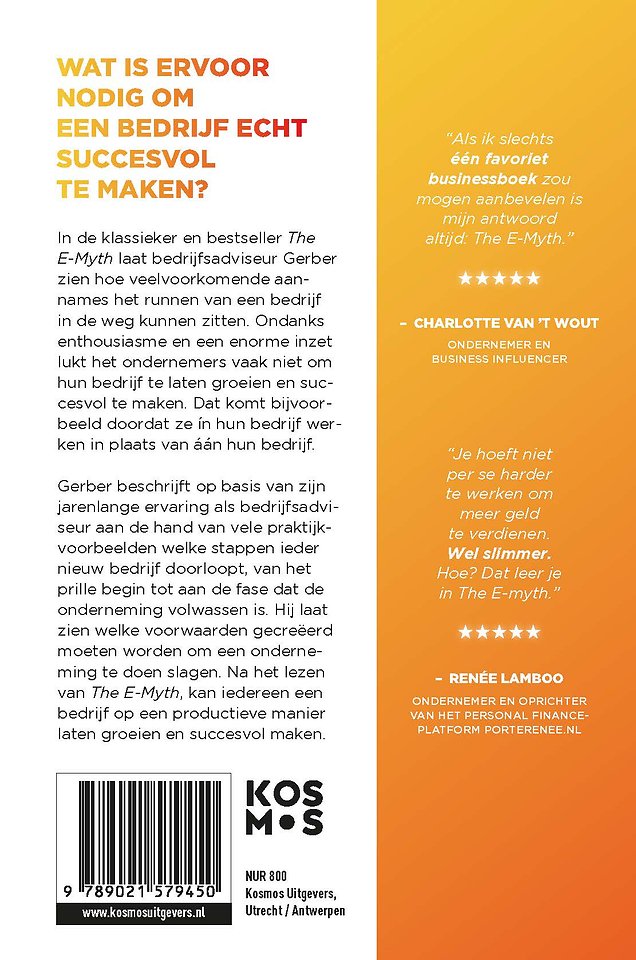 In de instantklassieker The E-Myth laat bedrijfsadviseur Gerber zien hoe veelvoorkomende aannames het runnen van een bedrijf in de weg kunnen zitten. Ondanks een enorme inzet lukt het veel ondernemers niet om hun bedrijf te laten groeien en succesvol te maken. Dat komt bijvoorbeeld doordat ze ín hun bedrijf werken in plaats van áán hun bedrijf.