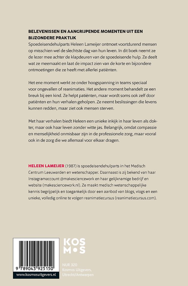 Spoedeisendehulparts Heleen Lameijer (@makesciencework op Instagram) ontmoet voortdurend mensen op misschien wel de slechtste dag van hun leven. In dit boek neemt ze de lezer mee achter de klapdeuren van de spoedeisende hulp. Ze deelt wat ze meemaakt en laat de impact zien van de korte en bijzondere ontmoetingen die ze heeft met allerlei patiënten.