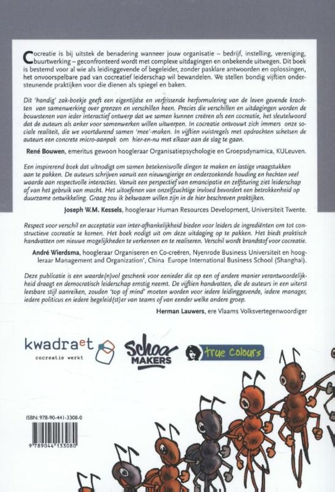 Cocreatie is bij uitstek de benadering wanneer jouw organisatie - bedrijf, instelling, vereniging, buurtwerking - geconfronteerd wordt met complexe uitdagingen en onbekende uitwegen. Dit boek is bestemd voor al wie als leidinggevende of begeleider, zonder pasklare antwoorden en oplossingen, het onvoorspelbare pad van cocreatief leiderschap wil bewandelen. We stellen bondig vijftien ondersteunende praktijken voor die dienen als spiegel en baken.Dit 'handig' zak-boekje geeft een eigentijdse en verfrissende herformulering van de leven gevende krachten van samenwerking over grenzen en verschillen heen. Precies die verschillen en uitdagingen worden de bouwstenen van ieder interactief ontwerp dat we samen kunnen creëren als een cocreatie, het sleutelwoord dat de auteurs als anker voor samenwerken willen uitwerpen. In cocreatie ontvouwt zich immers onze sociale realiteit, die we voortdurend samen 'mee'-maken. In vijftien vuistregels met opdrachten schetsen de auteurs een concrete micro-aanpak om hier-en-nu met elkaar aan de slag te gaan.René Bouwen, emeritus gewoon hoogleraar Organisatiepsychologie en Groepsdynamica, KULeuven.Een inspirerend boek dat uitnodigt om samen betekenisvolle dingen te maken en lastige vraagstukken aan te pakken. De auteurs schrijven vanuit een nieuwsgierige en onderzoekende houding en hechten veel waarde aan respectvolle interacties. Vanuit een perspectief van emancipatie en zelfsturing ziet leiderschap af van het gebruik van macht. Het uitoefenen van onzelfzuchtige invloed bevordert een betrokkenheid op duurzame ontwikkeling. Graag zou ik bekwaam willen zijn in de hier beschreven praktijken.Joseph W.M. Kessels, hoogleraar Human Resources Development, Universiteit Twente.Respect voor verschil en acceptatie van inter-afhankelijkheid bieden voor leiders de ingrediënten om tot constructieve cocreatie te komen. Het boek nodigt uit om deze uitdaging op te pakken. Het biedt praktisch handvatten om nieuwe mogelijkheden te verkennen en te realiseren. Verschil wordt brandstof voor cocreatie.André Wierdsma, hoogleraar Organiseren en Co-creëren, Nyenrode Business Universiteit en hoogleraar Management and Organization', China Europe International Business School (Shanghai).Deze publicatie is een waarde(n)vol geschenk voor eenieder die op een of andere manier verantwoordelijkheid draagt en democratisch leiderschap ernstig neemt. De vijftien handvatten, die de auteurs in een uiterst leesbare stijl aanreiken, zouden 'top of mind' moeten worden voor iedere leidinggevende, iedere manager, iedere politicus en iedere begeleid(st)er van teams of van eender welke andere groep.Herman Lauwers, ere Vlaams Volksvertegenwoordiger