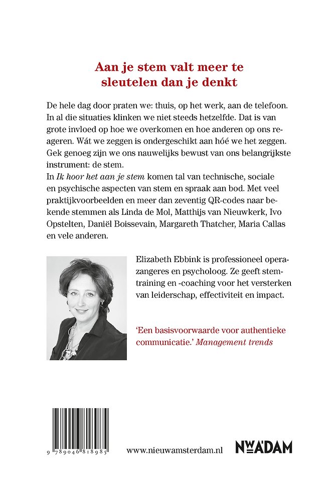 In 'Ik hoor het aan je stem' komen tal van technische, sociale en psychische aspecten van onze spraak aan bod. Met vele praktijkvoorbeelden, heldere tips en oefeningen om meer regie over je stem te krijgen en meer dan zeventig links via QR-codes naar bekende stemmen op YouTube. Luister met andere oren naar Linda de Mol, Matthijs van Nieuwkerk, Mien Dobbelsteen, Jules Deelder, Margareth Thatcher, Maria Callas en vele anderen.