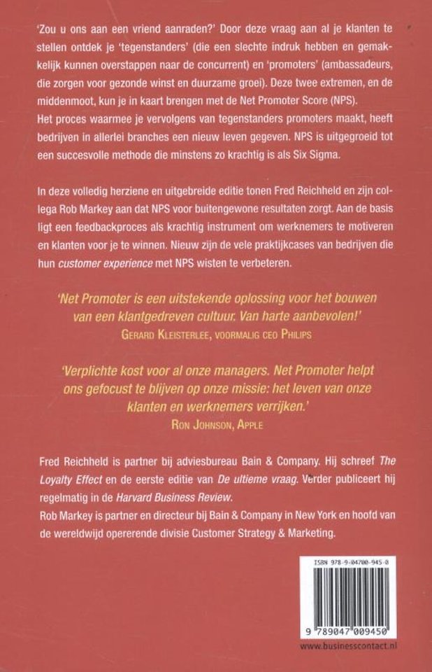 Meer over de auteurs'Zou u ons aan een vriend aanraden?' Door deze vraag aan al je klanten te stellen ontdek je 'tegenstanders' (die een slechte indruk hebben en gemakkelijk kunnen overstappen naar de concurrent) en 'promoters' (ambassadeurs, die zorgen voor gezonde winst en duurzame groei). Deze twee extremen, en de middenmoot, kun je in kaart brengen met de Net Promoter Score (NPS). Het proces waarmee je vervolgens van tegenstanders promoters maakt, heeft bedrijven in allerlei branches een nieuw leven gegeven. NPS is uitgegroeid tot een succesvolle methode die minstens zo krachtig is als Six Sigma.