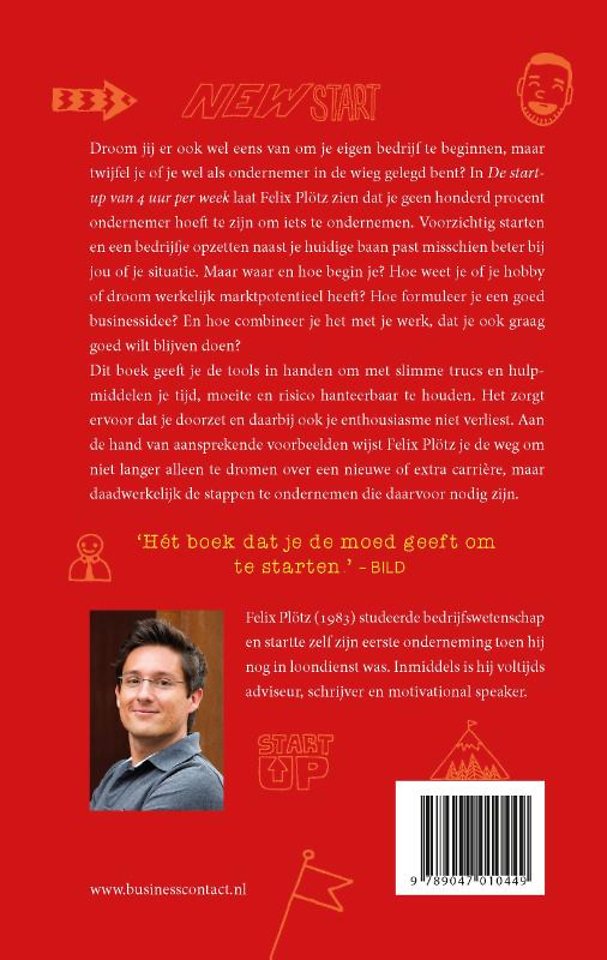 Meer over Felix PlötzDroom jij er ook wel eens van om je eigen bedrijf te beginnen, maar twijfel je of je wel als ondernemer in de wieg gelegd bent? In ‘De start-up van 4 uur per week’ laat Felix Plötz zien dat je geen honderd procent ondernemer hoeft te zijn om iets te ondernemen. Voorzichtig starten en een bedrijfje opzetten naast je huidige baan past misschien beter bij jou of je situatie. Maar waar en hoe begin je? Hoe weet je of je hobby of droom werkelijk marktpotentieel heeft? Hoe formuleer je een goed businessidee? En hoe combineer je het met je werk, dat je ook graag goed wilt blijven doen?