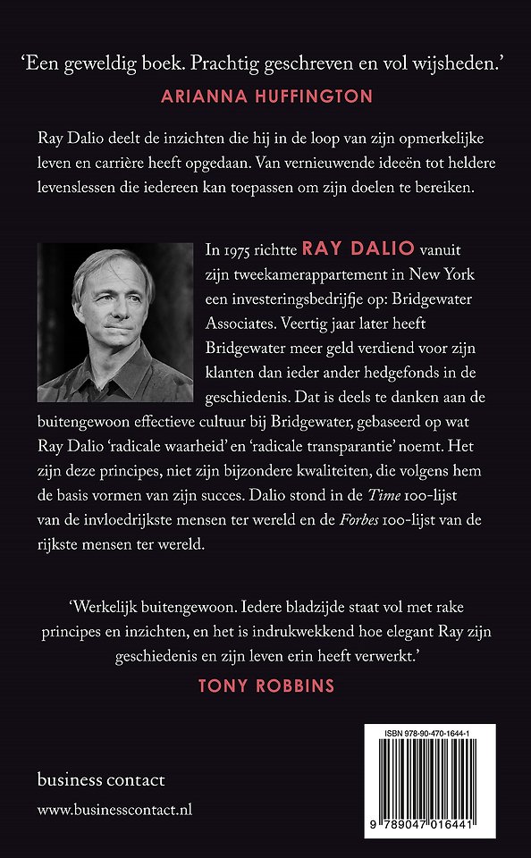 In 1975 richtte Ray Dalio vanuit zijn tweekamerappartement in New York een investeringsbedrijfje op, Bridgewater Associates. Veertig jaar later heeft Bridgewater meer geld verdiend voor zijn klanten dan ieder ander hedgefonds in de geschiedenis. Dat is deels te danken aan de buitengewoon effectieve cultuur bij Bridgewater, gebaseerd op wat Ray Dalio ‘radicale waarheid’ en ‘radicale transparantie’ noemt. Het zijn deze principes, niet zijn bijzondere kwaliteiten, die volgens hem de basis vormen van zijn succes.