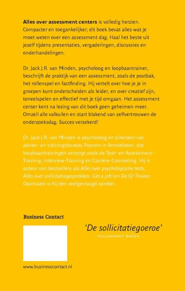 Het afgegrendelde land van de betere banen kent strenge toelatingseisen. Het enige paspoort dat het erkent is het testrapport. Alleen voor het stempel 'geslaagd' wordt de slagboom opgehaald. Vandaar dat de groeiende stroom bezoekers van test- en wervings- en selectiebureaus graag wil weten wat hun te wachten staat als ze uitgenodigd worden voor een assessment center. Dit is een nieuwe selectietechniek voor hoger personeel, met name managers en commerciële functionarissen. Het gaat daarbij niet om de intelligentie of de persoonlijkheid van de sollicitant, maar om het gedrag. Een dag lang wordt de kandidaat geobserveerd bij rollenspellen, presentaties, vergaderingen, discussies en andere tests en worden de resultaten van zijn 'postbak-opdracht' geanalyseerd. Van Minden geeft in zijn nieuwe boek talloze adviezen over hoe je je in groepen kunt onderscheiden als leider, hoe creatief te zijn, toneel te spelen en effectief time management te bedrijven op de testdag. Daarnaast biedt het lezers de kans opdrachten thuis te oefenen opdat zij optimaal voorbereid aan een assessment center van start kunnen gaan.