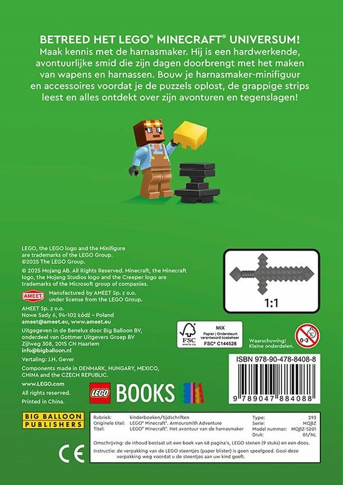 Betreed het LEGO® Minecraft®-universum! Maak in 'Het avontuur van de harnasmaker' kennis met de harnasmaker. Hij is een hardwerkende, avontuurlijke smid die zijn dagen doorbrengt met het maken van wapens en harnassen. Bouw je harnasmaker-minifiguur met accessoires voordat je de puzzels oplost, de grappige strips leest en alles ontdekt over zijn avonturen en tegenslagen!