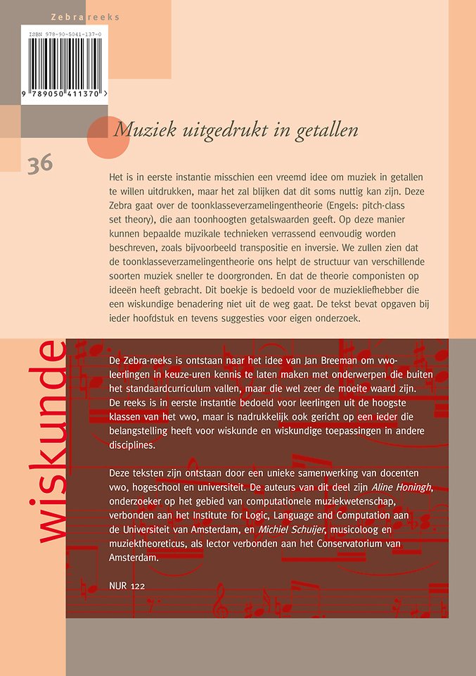 Het is in eerste instantie misschien een vreemd idee om muziek in getallen te willen uitdrukken, maar het zal blijken dat dit soms nuttig kan zijn. Deze Zebra gaat over de toonklasseverzamelingentheorie (Engels: pitch-class set theory), die aan toonhoogten getalswaarden geeft. Op deze manier kunnen bepaalde muzikale technieken verrassend eenvoudig worden beschreven, zoals bijvoorbeeld transpositie en inversie. We zullen zien dat de toonklasseverzamelingentheorie ons helpt de structuur van verschillende soorten muziek sneller te doorgronden. En dat de theorie componisten op ideeën heeft gebracht. Dit boekje is bedoeld voor de muziekliefhebber die een wiskundige benadering niet uit de weg gaat. De tekst bevat opgaven bij ieder hoofdstuk en tevens suggesties voor eigen onderzoek.