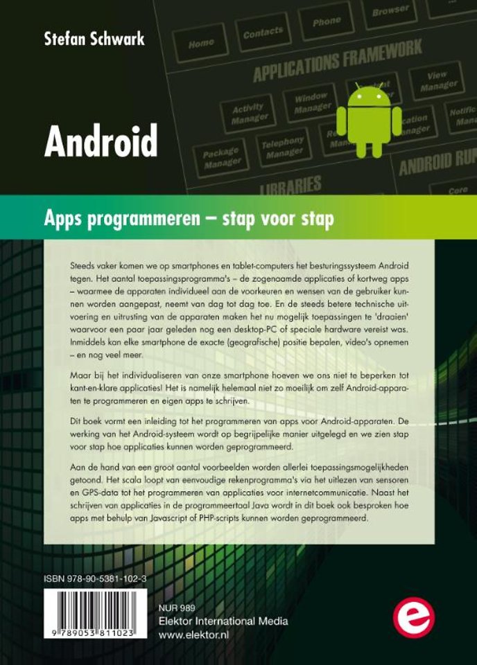 Dit boek vormt een inleiding tot het programmeren van apps voor Android-apparaten. De werking van het Android-systeem wordt op begrijpelijke manier uitgelegd en we zien stap voor stap hoe applicaties kunnen worden geprogrammeerd. Aan de hand van een groot aantal voorbeelden worden allerlei toepassingsmogelijkheden getoond. Het scala loopt van eenvoudige rekenprogramma's via het uitlezen van sensoren en GPS-data tot het programmeren van applicaties voor internetcommunicatie. Naast het schrijven van applicaties in de programmeertaal Java wordt in dit boek ook besproken hoe apps met behulp van Javascript of PHP-scripts kunnen worden geprogrammeerd.
