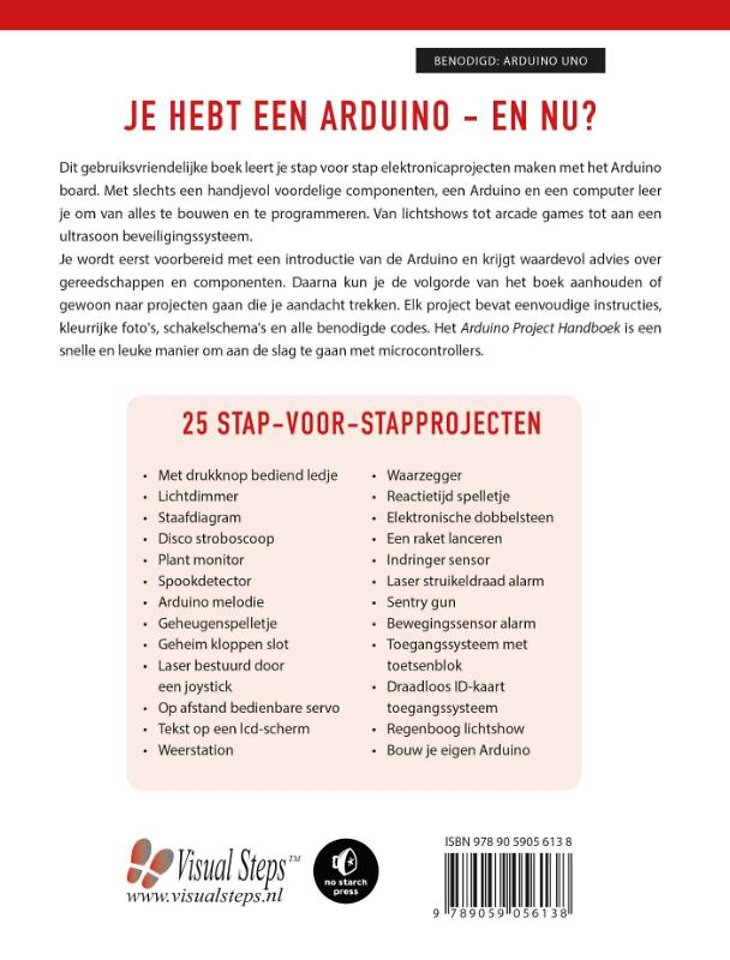 Het Arduino Project Handboek is een boek voor beginnende gebruikers van Arduino (ook wel Genuino genoemd). Arduino is een opensource-computerplatform dat bedoeld is voor het ontwerpen van slimme en creatieve objecten. Het boek is volledig in kleur en laat je 25 leuke en interactieve projecten bouwen. Er wordt gewerkt met ledjes, sensoren, motoren, LCD schermen, antiblokkeersystemen en zelfs zekeringen om daarmee projecten te bouwen zoals een bewegingsmelder, een draadloos scansysteem voor identiteitskaarten, een ultrasone robot, een weerstation, videospellen voor LCD schermen en een raketwerper.