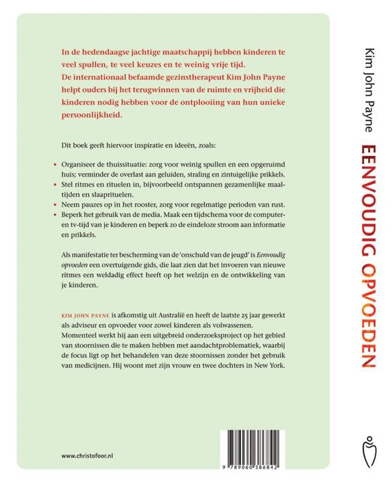 In de hedendaagse jachtige maatschappij hebben kinderen te veel spullen, te veel keuzes en te weinig vrije tijd. De internationaal befaamde gezinstherapeut Kim John Payne helpt ouders bij het terugwinnen van de ruimte en vrijheid die kinderen nodig hebben voor de ontplooiing van hun unieke persoonlijkheid. Eenvoudig opvoeden geeft hiervoor inspiratie en ideeën, zoals: