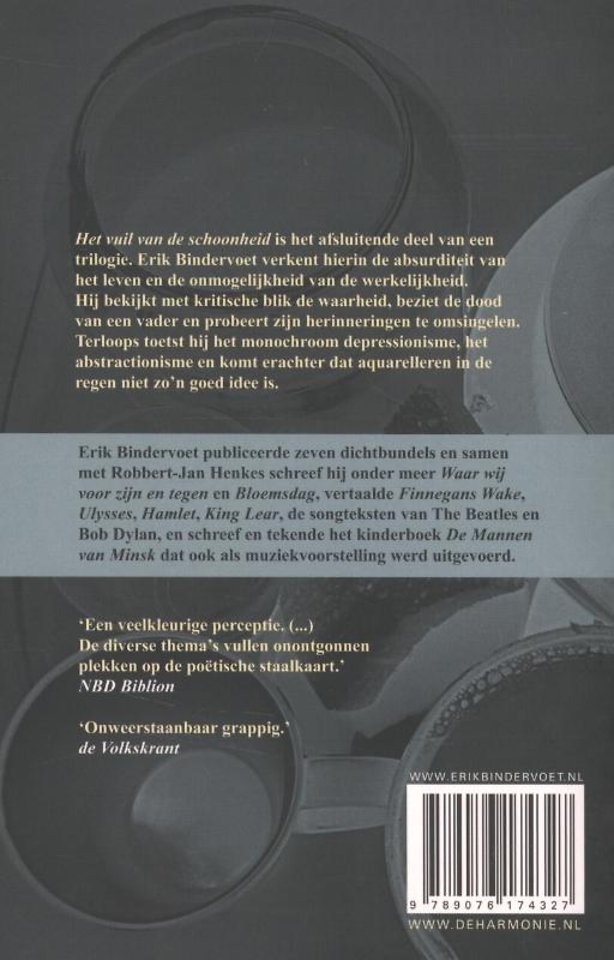 Het vuil van de schoonheid is het derde, afsluitende deel van een trilogie. Dichter Erik Bindervoet verkent hierin de absurditeit van het leven en de onmogelijkheid van de werkelijkheid. Hij bekijkt met kritische blik de waarheid, beziet de dood van een vader en probeert zijn herinneringen te omsingelen. Terloops toetst hij het monochroom depressionisme, het abstractionisme en komt hij erachter dat aquarelleren in de regen niet zo'n goed idee is.