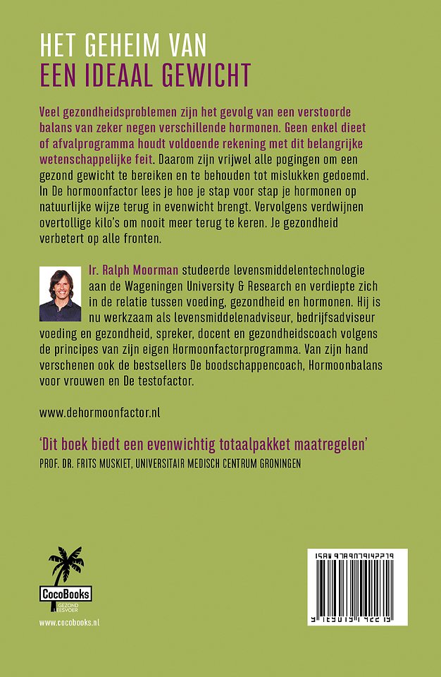 Vernieuwde en uitgebreide uitgave in kleur. Hormonen spelen een grote rol in gezondheid en gewicht. Begrip over wat er allemaal mis kan gaan met onze hormonen is daarom belangrijk. In dit helder geschreven en prachtig vormgegeven boek legt ir. Ralph Moorman uit hoe je hormonen in balans kunt krijgen en houden. Met uitgebalanceerde hormonen heb je meer energie, een stralende huid en bereik je gemakkelijker een ideaal gewicht. Daar is geen hongerdieet voor nodig, je hoeft er geen gezonde maar vieze producten voor te eten of fanatiek voor te sporten.