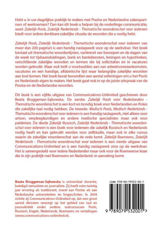 Dit boek is de vijfde uitgave van Communications-Unlimited geschreven door Beata Bruggeman-Sekowska . De eerste: Zakelijk Pools voor Nederlanders, thematische woordenschat is een kort en bondig boek voor Nederlanders en Polen die zakelijke taal nodig hebben. De tweede: Medisch Pools, Medisch Nederlands, thematische woordenschat voor iedereen is een handig naslagwerk, niet alleen voor artsen, verpleegkundigen en andere medische specialisten maar ook voor patiënten. De derde Zakelijk Russisch, Zakelijk Nederlands, thematische woordenschat voor iedereen is een boek voor iedereen die zakelijk Russisch en Nederlands nodig heeft en kan gebruikt worden voor zelfstudie, maar ook in elke cursus waarin de zakelijke woordenschat aan de orde komt. Zakelijk Roemeens, Zakelijk Nederlands, thematische woordenschat voor iedereen is een vierde uitgave van Communications-unlimited en is een handig naslagwerk voor op de werkvloer. Het is samengesteld voor iedere Nederlander maar ook voor de Roemeense lezer die in zijn praktijk met Roemeens en Nederlands in aanraking komt.