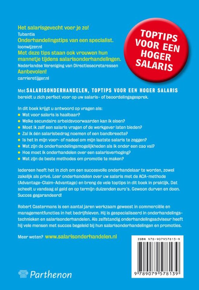 Iedereen heeft het in zich om een succesvolle onderhandelaar te worden, zowel zakelijk als privé. Leer onderhandelen over uw salaris met de ACA-methode (Advantage-Claim-Advantage) en breng de vele toptips in dit boek in praktijk. Dat scheelt u vandaag al geld en op termijn duizenden euro's.