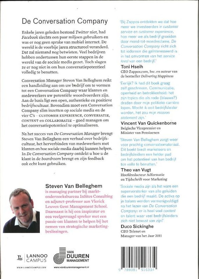 "Sociale media zijn als het ware een super versterker van alle geluiden die een bedrijf maakt. De activa op je balans worden vermenigvuldigd na het lezen van 'De Conversation Company': er is heel veel content en talent waar veel bedrijfsleiders zich niet bewust van zijn!" - Duco Sickinghe, CEO Telenet en Manager van het Jaar 2011.