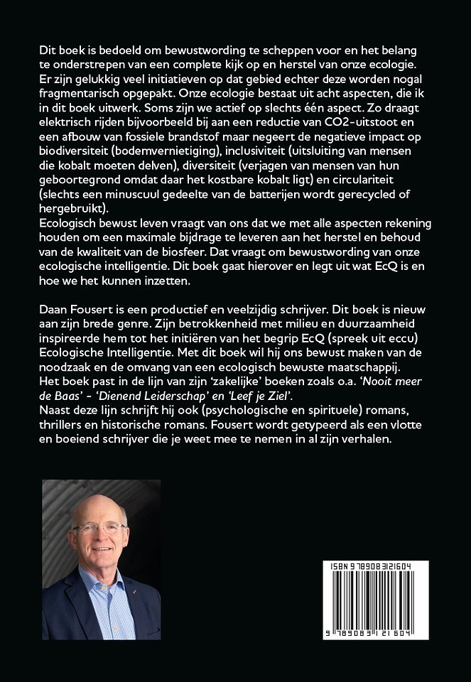 Daan Fousert is een productief en veelzijdig schrijver. Dit boek is nieuw aan zijn brede genre. Zijn betrokkenheid met milieu en duurzaamheid inspireerde hem tot het initiëren van het begrip EcQ (spreek uit eccu) Ecologische Intelligentie. Met dit boek wil hij ons bewust maken van de noodzaak en de omvang van een ecologisch bewuste maatschappij.