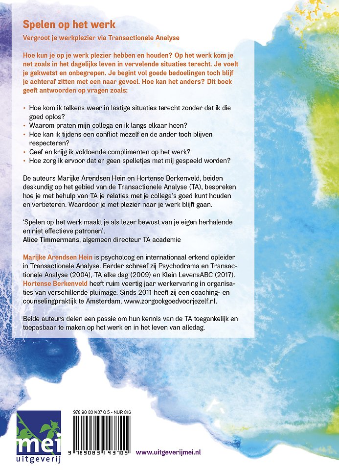 Marijke Arendsen Hein & Hortense Berkenveld zijn de auteurs van Spelen op het werk, vergroot je werkplezier met Transactionele Analyse. Een praktisch boek voor een ieder met of zonder kennis van de TA, die interesse heeft in het verbeteren van de communicatie op het werk.