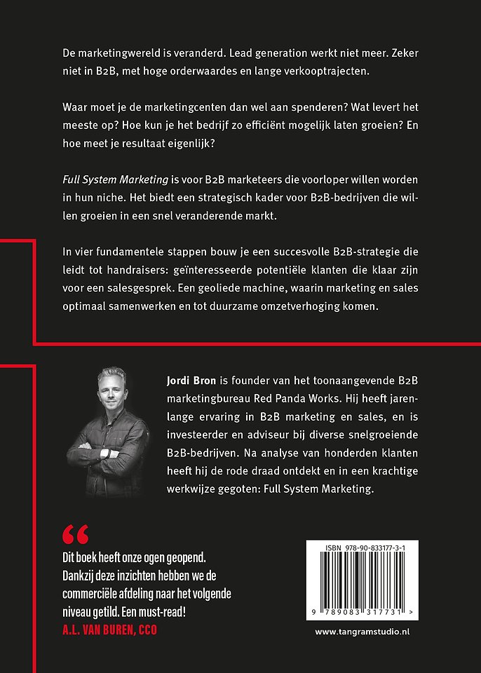 Full System Marketing is voor B2B marketeers die voorloper willen worden in hun niche. Het biedt een strategisch kader voor B2B-bedrijven die willen groeien in een snel veranderende markt. In vier fundamentele stappen bouw je een succesvolle B2B-strategie die leidt tot handraisers: geïnteresseerde potentiële klanten die klaar zijn voor een salesgesprek. Een geoliede machine, waarin marketing en sales optimaal samenwerken en tot duurzame omzetverhoging komen.
