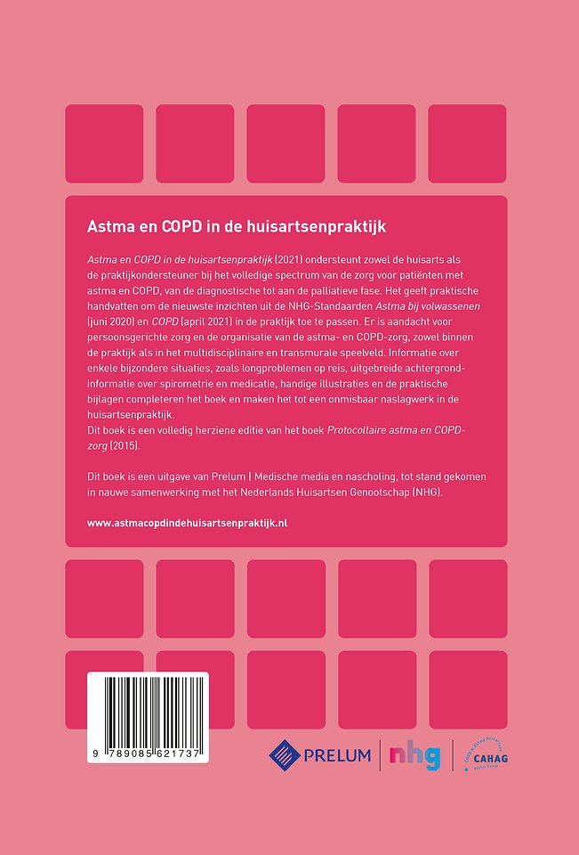 Astma en COPD in de huisartsenpraktijk (2021) ondersteunt zowel de huisarts als de praktijkondersteuner bij het volledige spectrum van de zorg voor patiënten met astma en COPD, van de diagnostische tot aan de palliatieve fase. Het geeft praktische handvatten om de nieuwste inzichten uit de NHG-Standaarden Astma bij volwassenen (juni 2020) en COPD (april 2021) in de praktijk toe te passen. Er is aandacht voor persoonsgerichte zorg en de organisatie van de astma- en COPD-zorg, zowel binnen de praktijk als in het multidisciplinaire en transmurale speelveld. Informatie over enkele bijzondere situaties, zoals longproblemen op reis, uitgebreide achtergrondinformatie over spirometrie en medicatie, handige illustraties en de praktische bijlagen completeren het boek en maken het tot een onmisbaar naslagwerk in de huisartsenpraktijk.