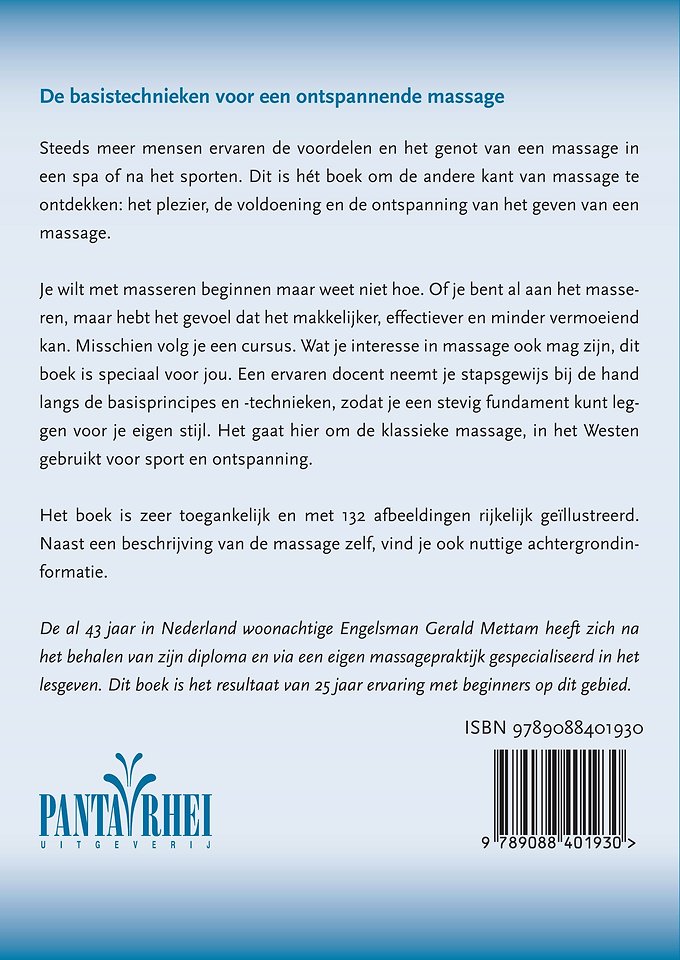 Je wilt met masseren beginnen maar weet niet hoe. Of je bent al aan het masseren, maar hebt het gevoel dat het makkelijker, effectiever en minder vermoeiend kan. Misschien volg je een cursus. Wat je interesse in massage ook mag zijn, dit boek is speciaal voor jou. Een ervaren docent neemt je stapsgewijs bij de hand langs de basisprincipes en -technieken, zodat je een stevig fundament kunt leggen voor je eigen stijl. Het gaat hier om de klassieke massage, in het Westen gebruikt voor sport en ontspanning.