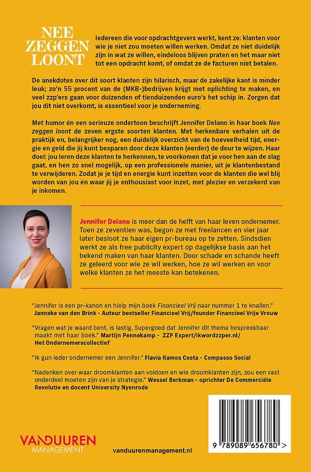 Zo’n 55 procent van de (MKB-) bedrijven krijgt met oplichting te maken, en veel zzp’ers zijn voor duizenden of tienduizenden euro’s het schip in gegaan. Zorgen dat jou dit niet overkomt, is essentieel voor je onderneming. Met humor én een serieuze ondertoon beschrijft Jennifer Delano in haar boek Nee zeggen loont de zeven ergste soorten klanten. Met herkenbare verhalen uit de praktijk, en belangrijker nog: inclusief een duidelijk overzicht van de hoeveelheid tijd, energie en geld die jij kunt besparen door deze klanten (eerder) de deur te wijzen.