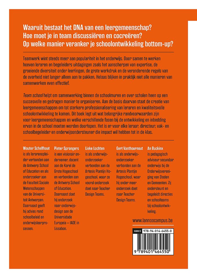 'Team school' is een praktische gids voor leerkrachten, procescoaches, schoolleiders en schoolbegeleiders van alle onderwijsniveaus. Het bevat praktische tips om leergemeenschappen makkelijk in de school in te voeren zodat kwaliteitsvol onderwijsvol centraal komt te staan. Het heeft daarbij speciale aandacht voor de procescoach en zorgt voor een werkbaar model met impact tot op de klasvloer.